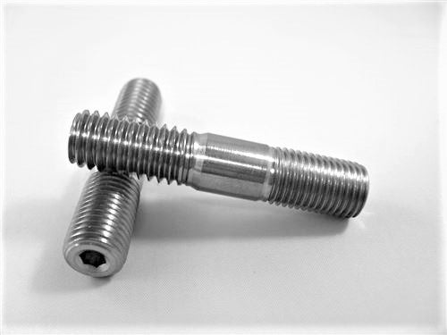 We make these studs from 140Ksi Titanium alloy. They have a course thread on one end and fine thread on the other.