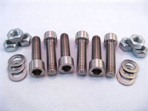 This Kit contains (6) 5/16"-18 x 1-1/4" Titanium Socket Head Screws, (6) 5/16" Thin Steel Washers and (6) 5/16"-18 All Metal Steel Lock Nuts.