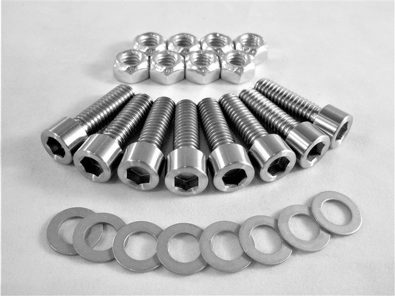 This Kit contains (8) 5/16"-18 x 1" Titanium Socket Head Screws, (8) 5/16" Thin AN Steel Washers, and (8) 5/16"-18 All Metal Steel Lock Nuts.