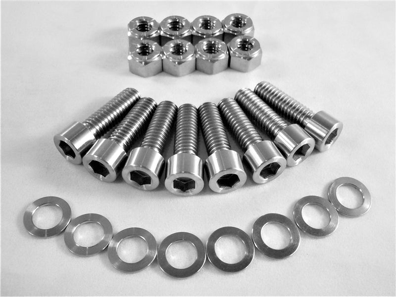 This Kit contains (8) 5/16"-18 x 1" Titanium Socket Head Screws, (8) 5/16" Titanium Washers, and (8) 5/16"-18 All Metal Titanium Lock Nuts.